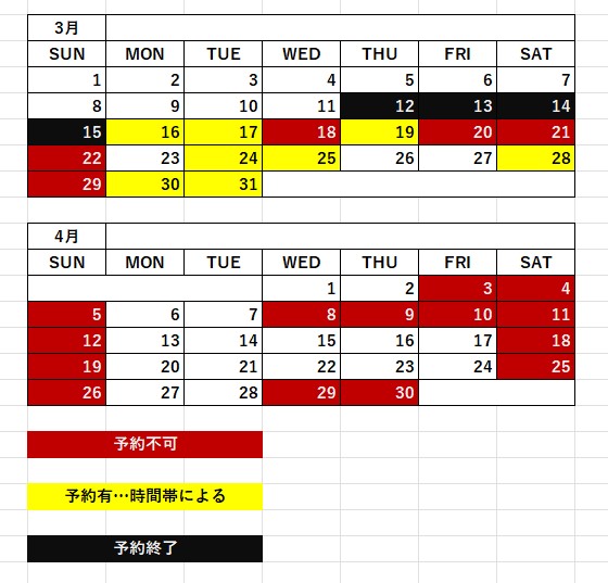 残念ながら、3月中の土日祝日は全て予定・予約が入っております。